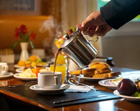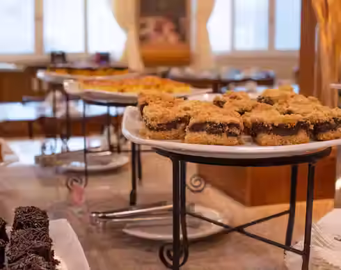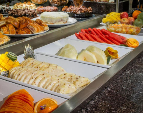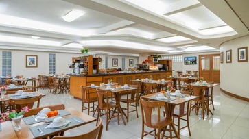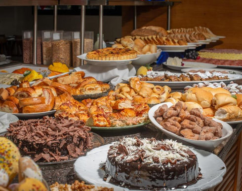 No restaurante do Laghetto Siena, o buffet de café da manhã é servido em louças de porcelana, com variedade de pães artesanais, geleias caseiras, cozinha live (ovos, tapiocas, waffles) e opções sem glúten.