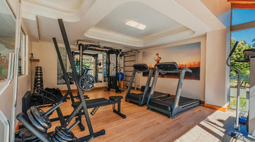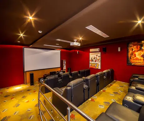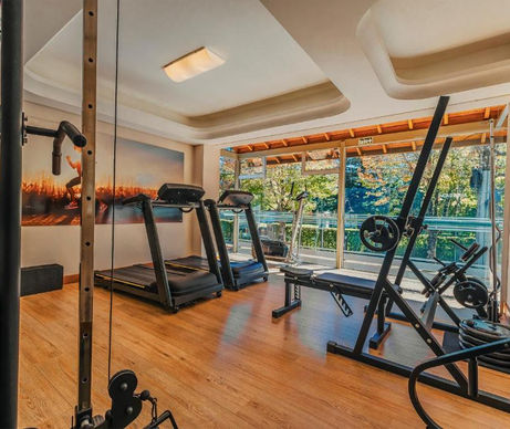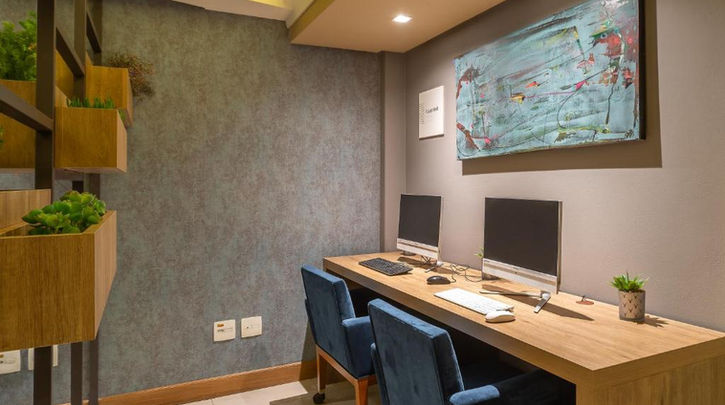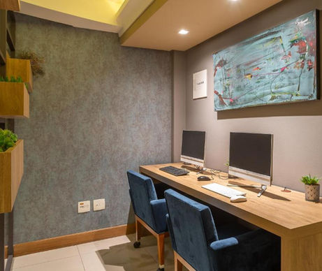Espaço Lounge: com poltronas de couro, biblioteca e playlist loung, Academia compacta: equipada com esteira, bicicleta ergométrica e pesos livres, Cinema Privativo: sessões sob agendamento, com pipoca e bebidas inclusas.